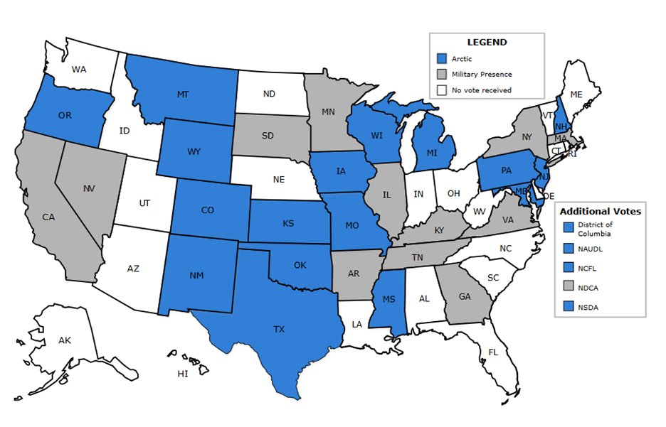 On January 10, 2025, ballots from 30 states, the National Speech and Debate Association, the National Catholic Forensic League, National Association for Urban Debate Leagues and the National Debate Coaches Association were received and tabulated for the 2025-26 National High School Policy Debate Topic. “Arctic” was selected over “Military Presence” by a vote of 21-13.