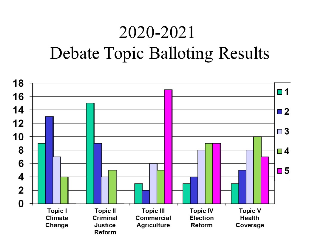 The National Federation of State High School Associations recently tabulated debate ballots from 29 states, Washington D.C., the National Speech and Debate Association, the National Debate Coaches Association, the National Association for Urban Debate Leagues and the National Catholic Forensic League. The returned ballots narrowed the five proposed topics to two for placement on the final ballot to select the 2020-2021 national high school debate topic. The five topic areas were ranked 1-5 with the two topic areas receiving the lowest totals –Climate Change and Criminal Justice Reform – placed on the final ballot. On January 10, 2020, the NFHS will announce the preferred topic area and resolution after states and national organizations are able to place a final vote. The 2020-2021 national high school debate topic and resolution will be posted on the NFHS Speech and Debate webpage and sent to state associations and affiliate members.