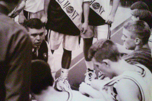 Coach Busick giving direction to the Bellmont High School boys basketball team in its East Noble game in which Colclasure played the entire 52 minutes