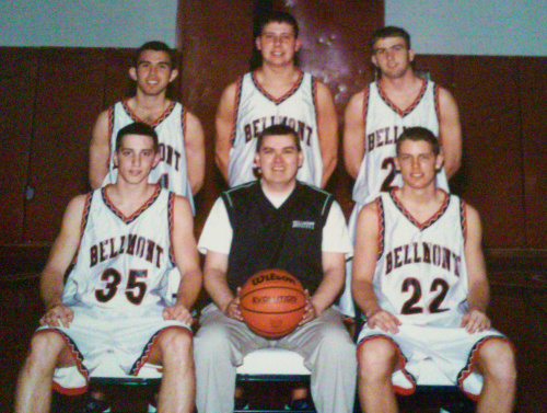 Shown above are the seniors on the 2001-02 Bellmont High School boys basketball team with Colclasure wearing No. 22 and coach Busick holding the basketball