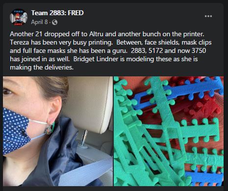 According to Culleton, the team had as many as five printers in operation, including two running 24 hours a day at the home of senior Tereza Hruba. Her work transitioned from N95 equivalent masks to face shields and later ear savers.