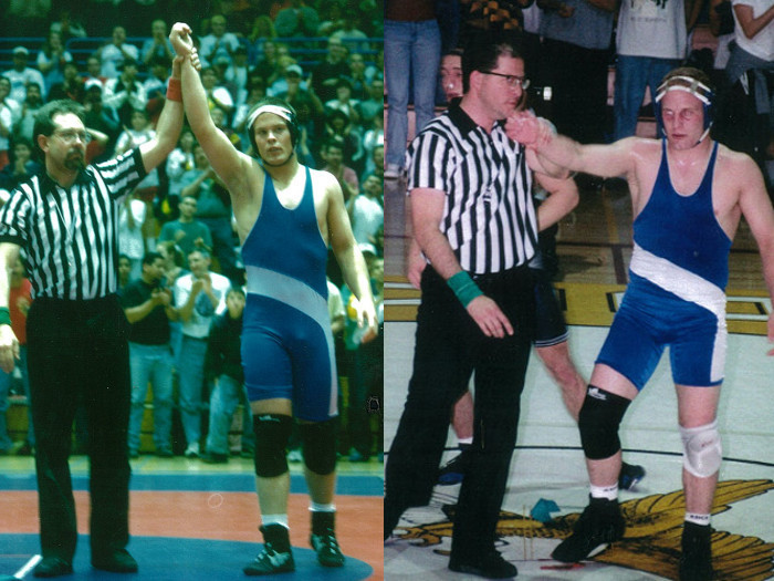 Michael Scott Owen (1998) and Troy Owen (1999) at NMAA state wrestling tournaments with Scott winning his fifth state title and Troy his fourth state title