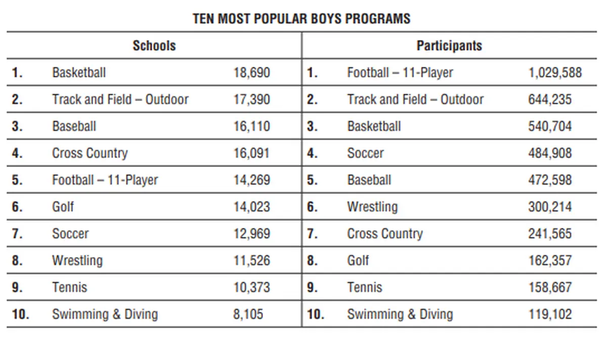 Outdoor track and field, soccer and golf had significant gains on the boys side, and all 10 of the most popular sports held steady or registered gains. After 11-player football (1,029,588) and outdoor track and field (644,235), the rest of the boys top 10 includes basketball (540,704), soccer (484,908), baseball (472,598), wrestling (300,214), cross country (241,565), golf (162,357), tennis (158,667) and swimming and diving (119,102).