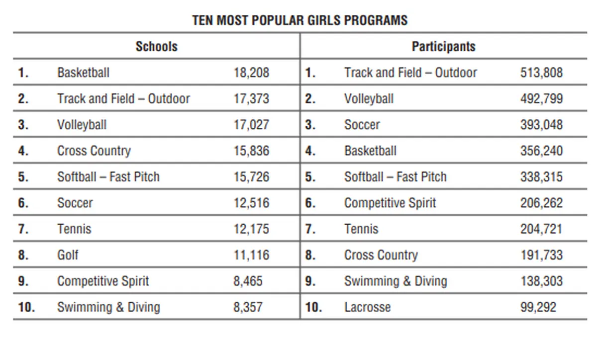 Outdoor track and field, volleyball and soccer all registered increases and remained the top three participatory sports for girls. Track and field participation increased to 513,808, followed by volleyball at 492,799 (up 2.85%) and soccer at 393,048 (up 2.38%). Basketball (356,240) remained in the No. 4 spot followed by fast-pitch softball (331,306). Competitive spirit (206,262) jumped to the sixth-most popular girls sport with a nearly 14-percent increase, while tennis (204,721) also increased by more than four percent. Cross country (191,733), swimming and diving (138,303) and lacrosse (99,292) round out the top 10.