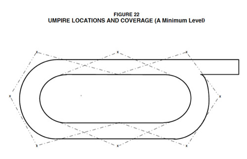 There’s more to just having enough people available to umpire, too. Umpires must know where they need to be at various times during the meet for the many different events that happen in this sport. For example, the following diagram (fig. 22) displays positions for a minimum level of coverage around the track for running events that are 400 meters or longer.
