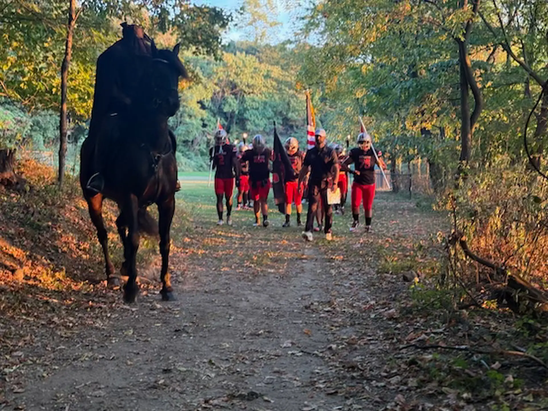 At Sleepy Hollow High football games, a real-life Headless Horseman leads the team to the field on the back of a jet-black horse.