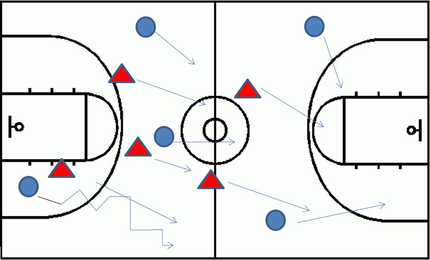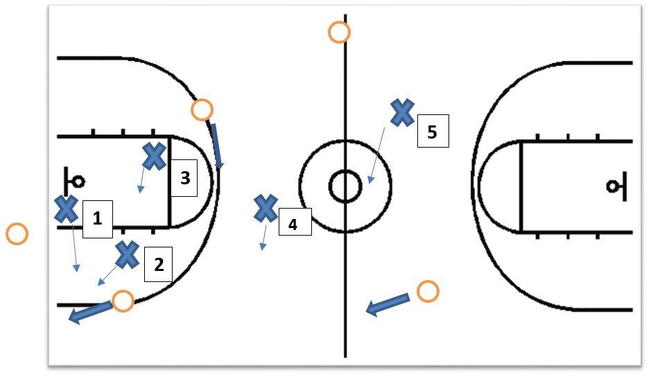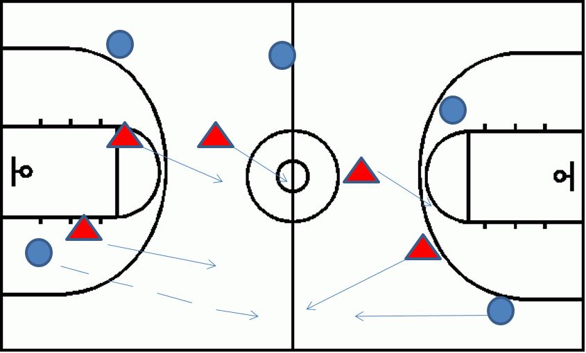 • “2-2-1”: Encourage show passes (bounce or lob passes) and allow lateral offensive movement; look for one sideline trap opportunity and then drop to half-court defense.
