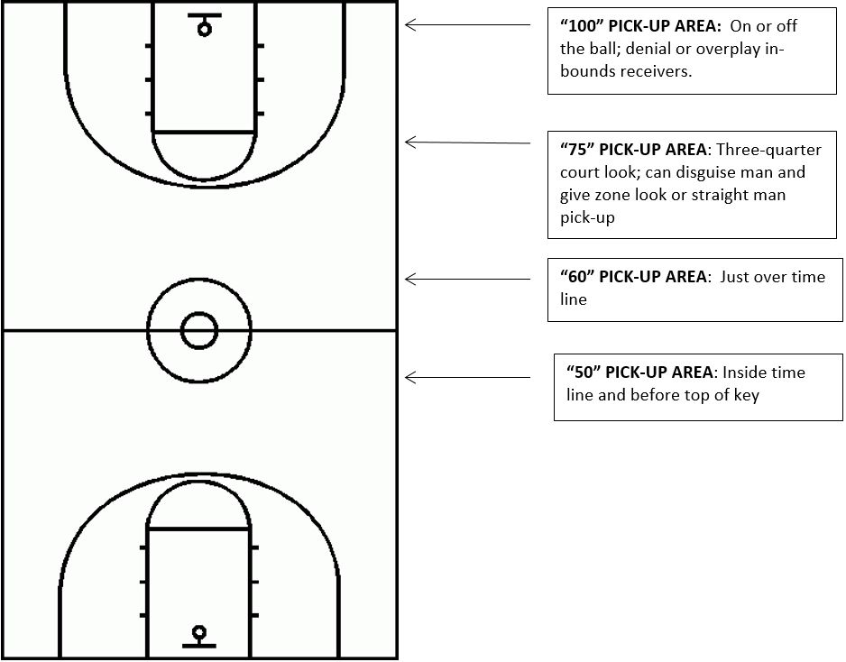 · “100” Area: from the offensive inception point back to our defensive baseline. We usually would utilize this pick-up point on dead-ball situations or against teams that were methodical inbounding the ball. From this point, we often would front the immediate inbound receivers and then “cheat” the on-ball defender by playing “center field” off the ball.