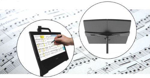 Since then, digital music stands and their accessories have improved dramatically and are used in all music rehearsal and performance situations. Now capable of providing the music for large ensembles like orchestras or concert bands, they include auto and manual page turns (moving to the next page when appropriate), on-page editing (the ability to add rehearsal marks), transposition (changing the key) and being controlled by the conductor’s score (so everyone is on the same page, the same place).