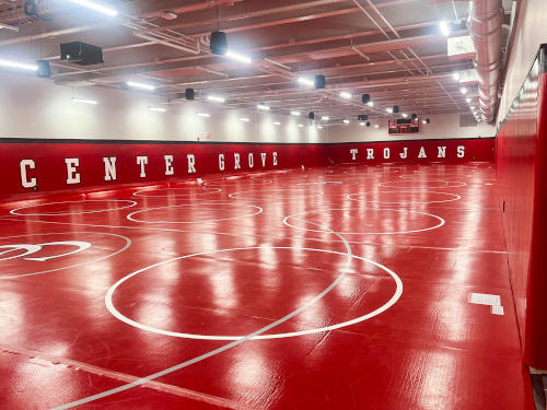 LANCER+BEEBE Architects recently completed a wrestling room renovation for Center Grove High School (CGHS), which is a part of the Center Grove Community School Corporation in Greenwood, Indiana. The CGHS Wrestling Room was renovated within a space that was previously a large two-story natatorium, and, therefore, the design team had the flexibility to establish the new length and width without restrictions of existing columns. With this freedom at hand, the room is 42 feet wide by 126 feet in length. All walls surrounding the practice room include 2-inch wall padding up to 6 feet high for safety, and doors and door hardware are recessed from the wall surface.