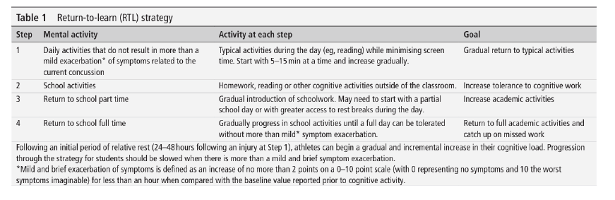 While students are starting RTL, they can simultaneously also begin a return-to-sport (RTS) protocol, although while still symptomatic, it is recommended considering this more as “increasing activity” rather than return to sport.